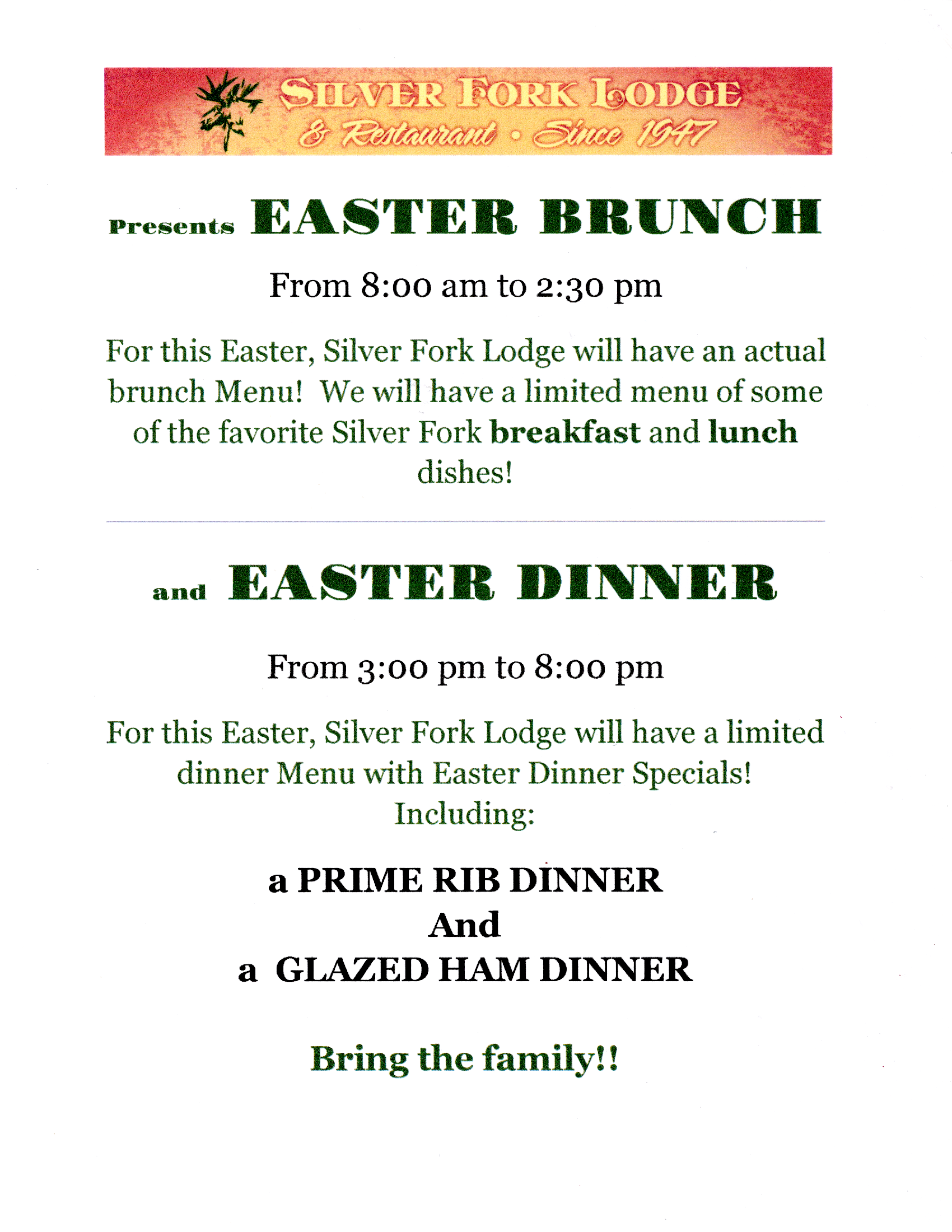 Silver Fork Lodge has Easter Brunch and Dinner!